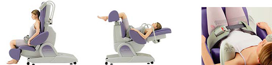■腰椎牽引装置(北口のみ) 腰の牽引は、脊柱管や椎間板等に障害がある場合に基本となる治療です。その基本姿勢は「股関節屈曲90度」で牽引することが理想とされています。その為、従来モデルでは膝を大きく屈曲し少しでもその姿勢に近づけるようにしてきました。しかし、現在最新の牽引装置は“座位”で行うのです。これこそ、正に目から鱗!理想の牽引姿勢なのです。